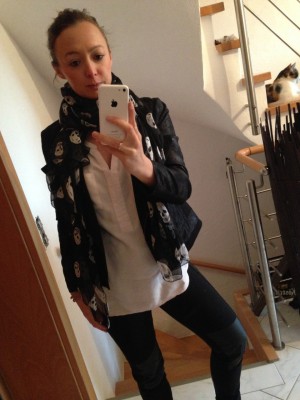 Outfit: Leggings Mom2Mom, Oversize-Bluse Street One, Seidenschal gefunden auf amazon.com, Jacke TAIFUN