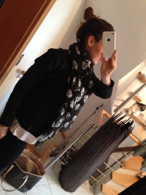 Outfit: Leggings Mom2Mom, Oversize-Bluse Street One, Seidenschal gefunden auf amazon.com, Jacke TAIFUN